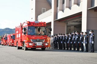 糸魚川市消防本部庁舎前で火災予防運動特別警戒の出発式が行われた