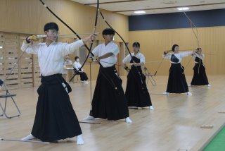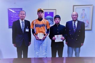 全国大会出場の激励を受けた野球の山岸宥稀選手(糸魚川中3年、中央左)と卓球の伊藤誠選手(青海中2年、同右)