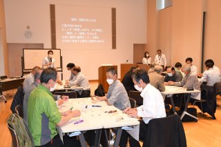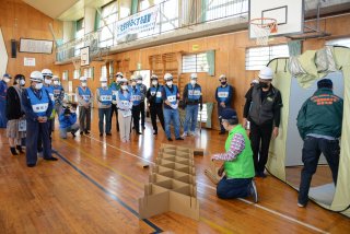 防災士から段ボールベッドの組み立て方を学ぶ参加者