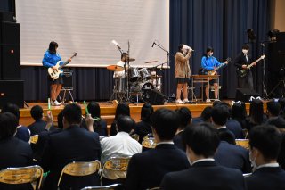 軽音学部のライブステージ。演奏はインターネットで生中継し、保護者へ届けられた