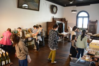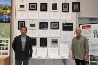 ビジターセンターで詩と七宝の展示を行っている国見さん(左)と山本さん