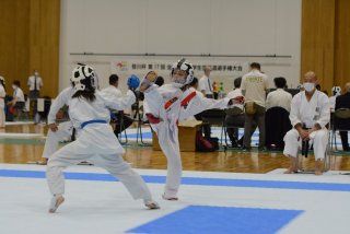 女子、小学4年生組手、冨田実乃莉(右、直心會)の試合