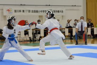 女子小学3年生組手決勝、後藤譜羽(左)―山﨑青央の上越勢同門対決
