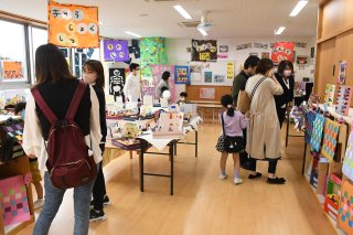 年長児の展示は小学校がテーマ。ランドセルや給食を個人制作し、教室を共同制作で再現