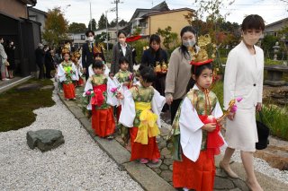 式の前に稚児行列を実施。庭園や参道を練り歩いた