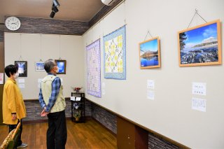 風景写真やパッチワークタペストリーなど会員の多彩な作品を展示