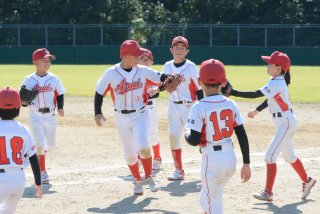 光陽旗争奪大会決勝、新井ジュニア―桜城ノースキング、最後、一塁邪飛を好捕して勝利し、歓喜の新井ナイン