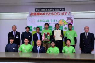 第75回新潟県駅伝競走大会で初優勝した糸魚川チームの優勝報告会(20日午後5時30分すぎ、市役所庁議室)