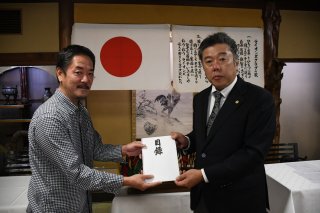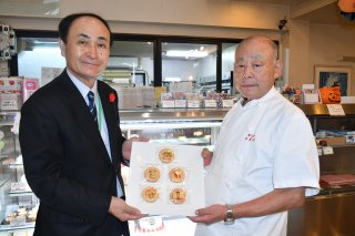 鎌田社長(右)から大竹事務局長へ、完成したクッキーが手渡された