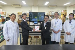上越環境科学センターの横田センター長(左から2人目)が早川教育長(同3人目)に目録を贈呈