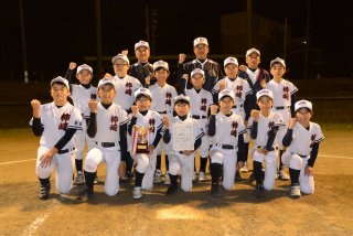 選手たちに囲まれ、社名入りスポンサーロゴの入ったトレーニングウエアを手にする藤川監督(中央左)と岡島社長