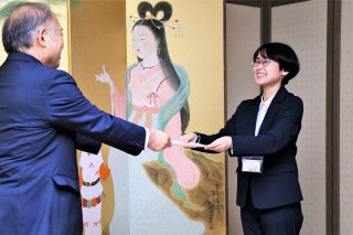 辞令交付で米田市長から任用通知書を受け取った齊藤さん
