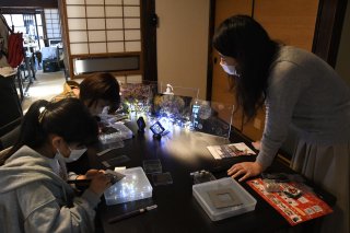 ビニールシートを彫刻刀で彫り、ステンドグラス風に仕上げるシャインカービングを体験