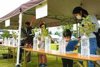 さまざまな体験、展示、販売コーナーはイベント開始と同時に混雑。葉から植物を当てるクイズなどで、自然を楽しく学んだ