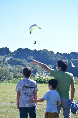 滑空するパラグライダーが早食い選手権に彩りを添えた