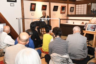 篠田さんが語り手を務め、杉本シズさんと杉山さんとの交流を語った。シズさんが杉山さんに託した人形など(右奥)も特別展示された