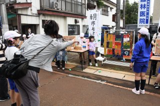 お買い上げの商品を手作りの〝バーコードスキャナー〟に通す園児