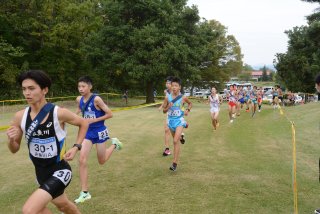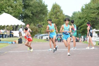 男子2区から3区へ、1位で城東(中央、水色)、1秒差の2位で新井(左、赤・白)がたすきリレー