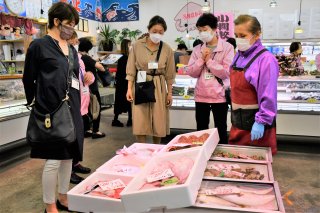 海の幸もPRし「おもてなしプラン」を通じて交流を深めた能生、津南町の商工会女性部員(マリンドリーム能生鮮魚センター・日本海魚正)