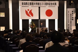 職員、来賓ら129人が参加し式典を挙行。小泉学長が大学のさらなる飛躍を誓った