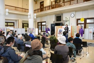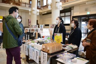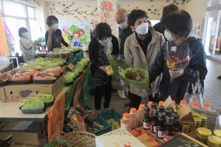 長野市産のリンゴやドライフラワーを買い求める人たち