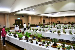広々とした会場に会員の丹精した盆栽と山野草を共に配置した合同展