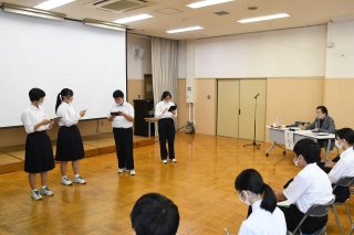 堀井さん(右)の指導を受け、朗読劇を披露する上越教育大附属中の3年生