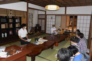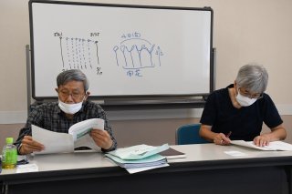 調査結果を報告する吉越さん(左)と会員の山田雅晴さん(2日、市民プラザ)