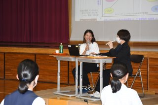 笑顔で話す冨田選手。妙高中時代の学年担任とのトークショー形式で行われた