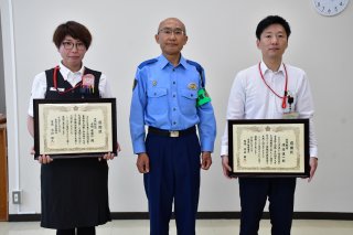 内山署長から感謝状を受けた渡邉さん(右)と吉田さん(左)