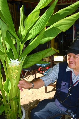 店頭で花が咲く秋ウコン。小林さんは初めて花を付けるまでの過程を、喜んで語ってくれた(9月30日撮影)