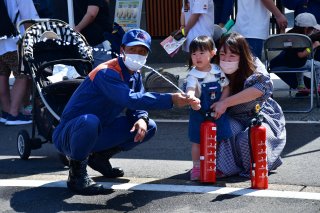 子どもや親子が多数参加した「消防・防災フェア」の体験コーナー(初期消火体験)