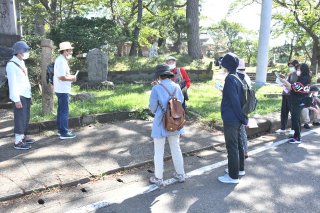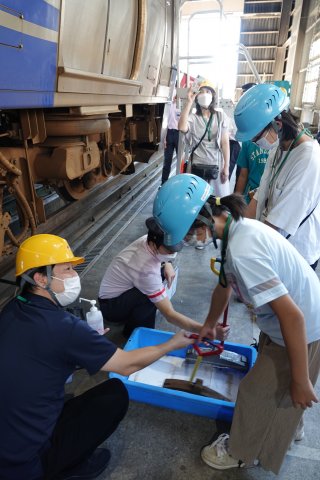 ブレーキの役割を果たす「制輪子」の新品と使用済みのものを持って、重さの違いを体感する参加者たち