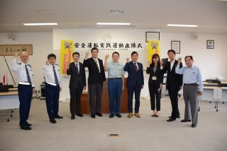 上越警察署で開かれた安全運転実践運動の出陣式。本年度モデル事業所のうち5社(中央5人)が出席し、交通事故防止へ気勢を上げた