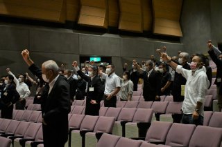 「エイ、エイ、オー」の掛け声に合わせて拳を突き上げた