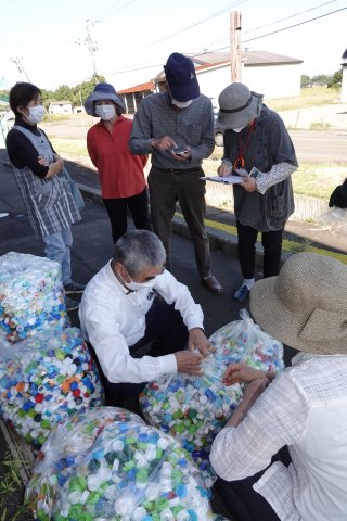 持ち寄ったキャップを集計する委員ら(1日、保倉地区公民館)