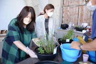 花の寄せ植えを楽しむ来場者(雪だるま物産館)