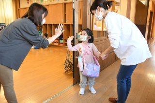 通常と異なり、保護者が園児を迎えに教室へ。停電で園内放送が使えない状況を想定した