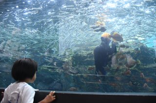 舞鰯シャイニリュージョンもハロウィーン仕様。カボチャ型のバケツが水槽内に登場し、イワシが集まる