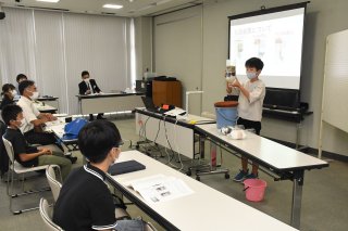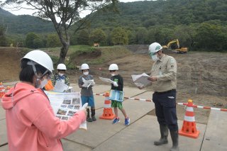 笹ケ峰ダムから引き揚げた土砂の使い方を聞く子どもたち