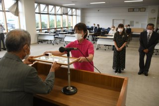 10万人目の秋山さん(写真左)。環境省信越自然環境事務所の酒向貴子所長から記念品が手渡された
