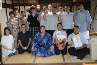 後輩たちや恩師、関係者から花束や祝いの品を贈られる欧勝海(前列中央)と父・正人さん、母・由利さん(前列左側)(26日午後5時ごろ、糸魚川市能生)