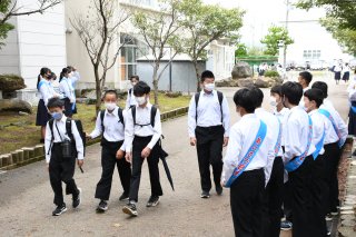 「あいさつ日本一」のたすきを掛けて玄関前であいさつする新部長たち