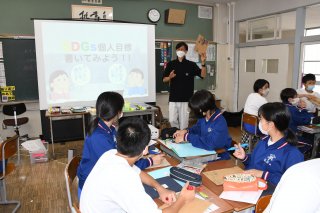 山﨑社長の話を聞き、ダンボールにSDGsの目標を書く生徒たち