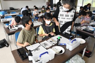 3年生の体験の様子。濃度の異なる墨と水を筆に含ませ、濃淡を生かした表現に挑戦