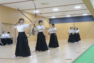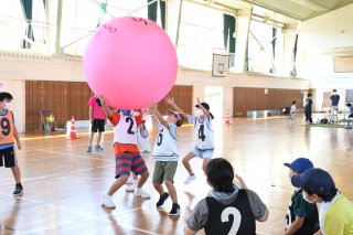 体育館で行われたキンボール。ルールを覚え、すぐに夢中でプレーした(大手町小)