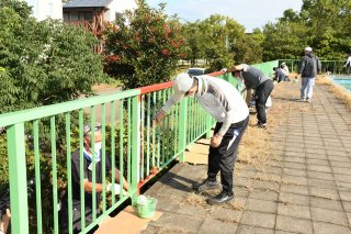 プールのフェンスを学校のカラー、緑色のペンキで塗装した(春日小)