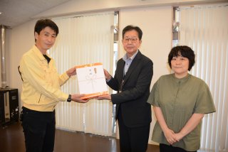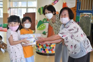園児の代表へ雑巾を手渡した(稲田保育園)