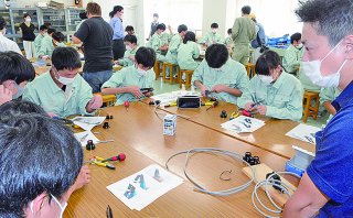 青年部の指導を受けながら、配線接続の実習を体験する上越総合技術高1年生