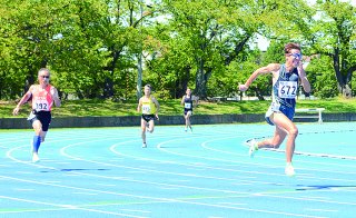 400メートル男子50歳、55歳、60歳、65歳以上クラス、最後の直線に入り懸命にラストスパート